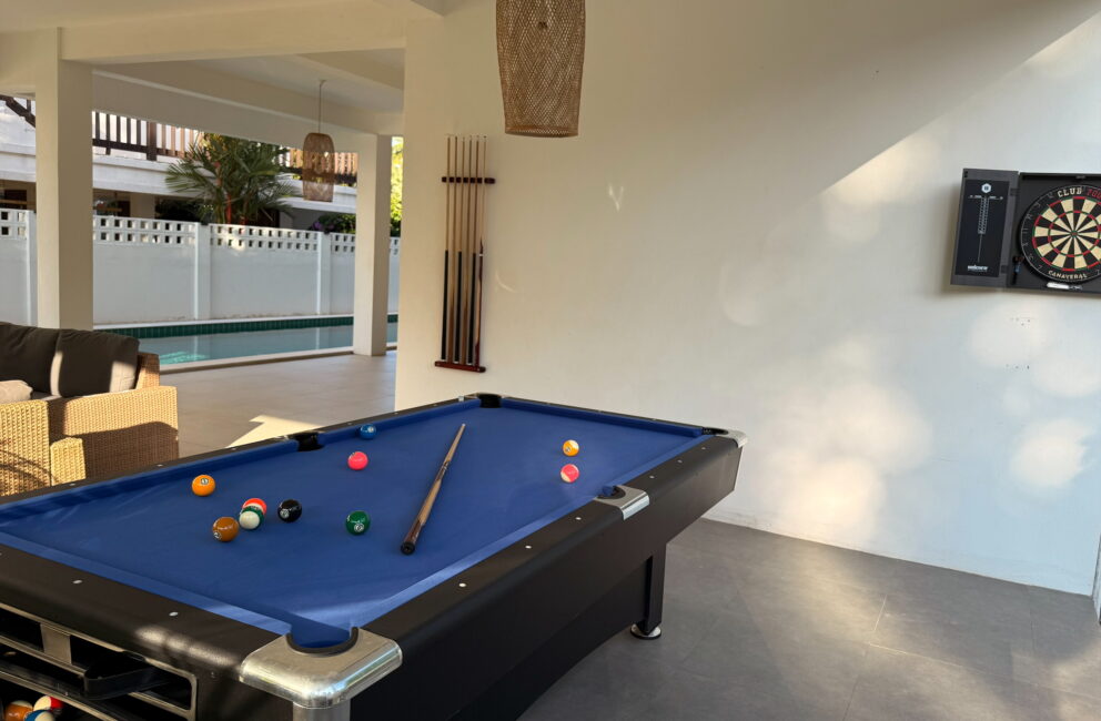 A spacious pool villa with good view towards the ocean. Parking space for car and motorbikes protected within the premises. Sofa area under roof close to the 14 meter long pool, down to 170 cm deep. An outdoor kitchenette for lighter cooking under roof. Pool table for leisure activity.
