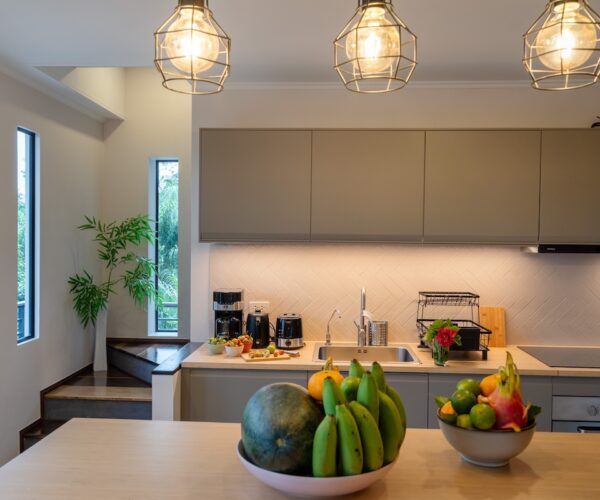 The master bedroom is of course located in the front facing the sunset and offers a perfect sea view overlooking the Andaman Sea and the islands glowing in the horizon. Plenty of space for a baby cot if you want to keep the small ones close to you.