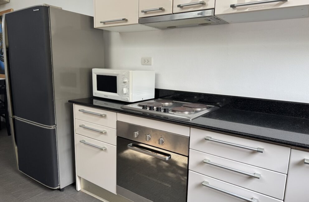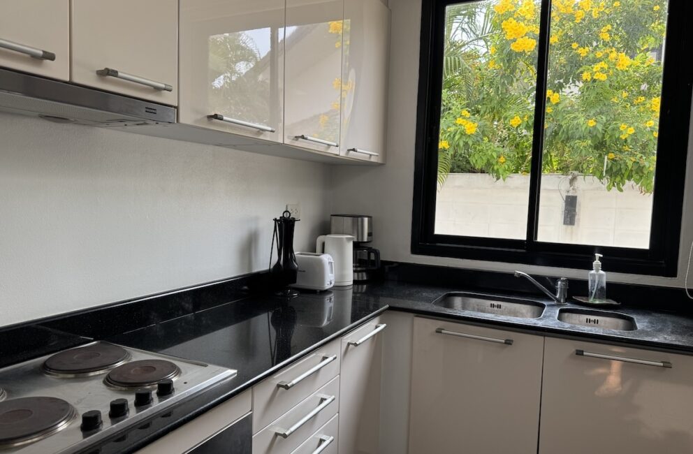 Ground floor is where you have the kitchen equipped with fridge/freezer, electric stove, oven, microwave, dishwasher, water dispenser, various kitchen utensils and AC. Dining table with chairs for six persons.