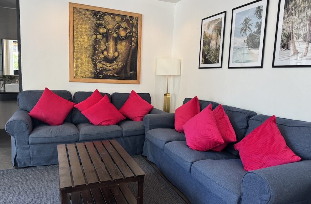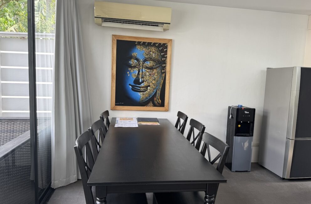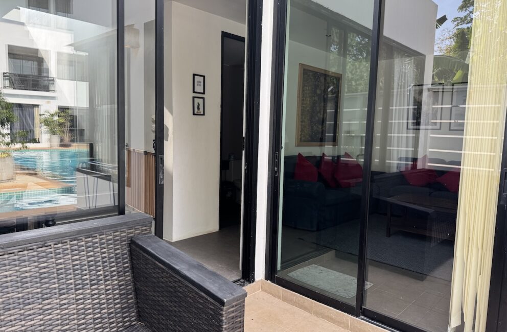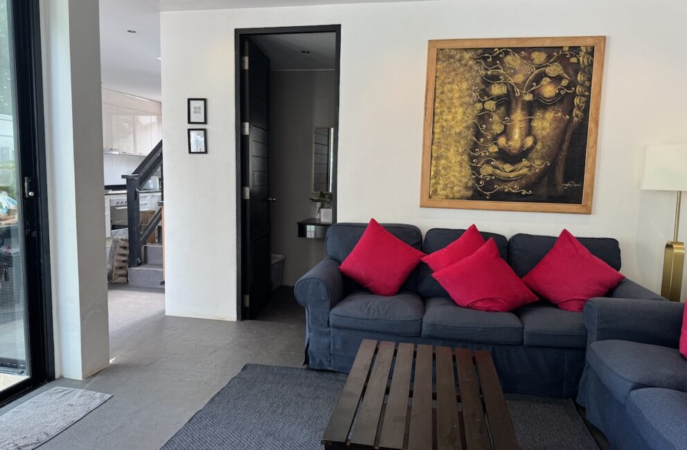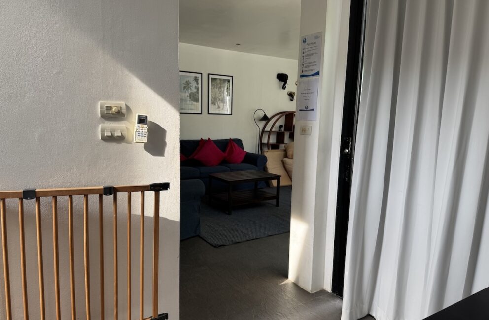 Living room is adjacent to the kitchen with a chill area with Smart-Tv and AC. Bathroom with toilet, sink, hot water shower and access to the outdoor area with sofas and stairs directly into the 600 sq.m. pool. Bedroom 1 on the ground floor a double bed 150 cm wide, storage, working desk and AC.