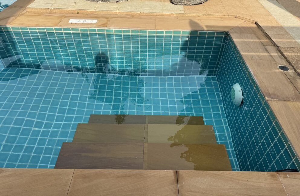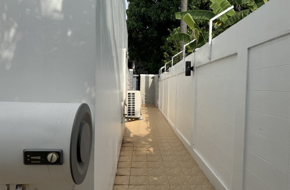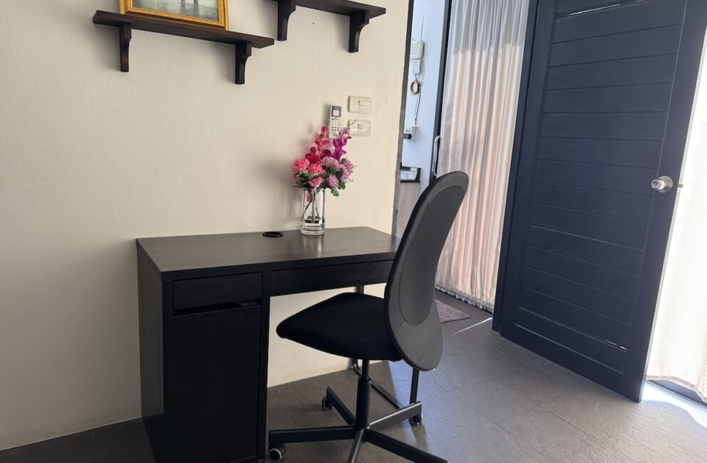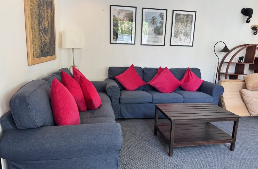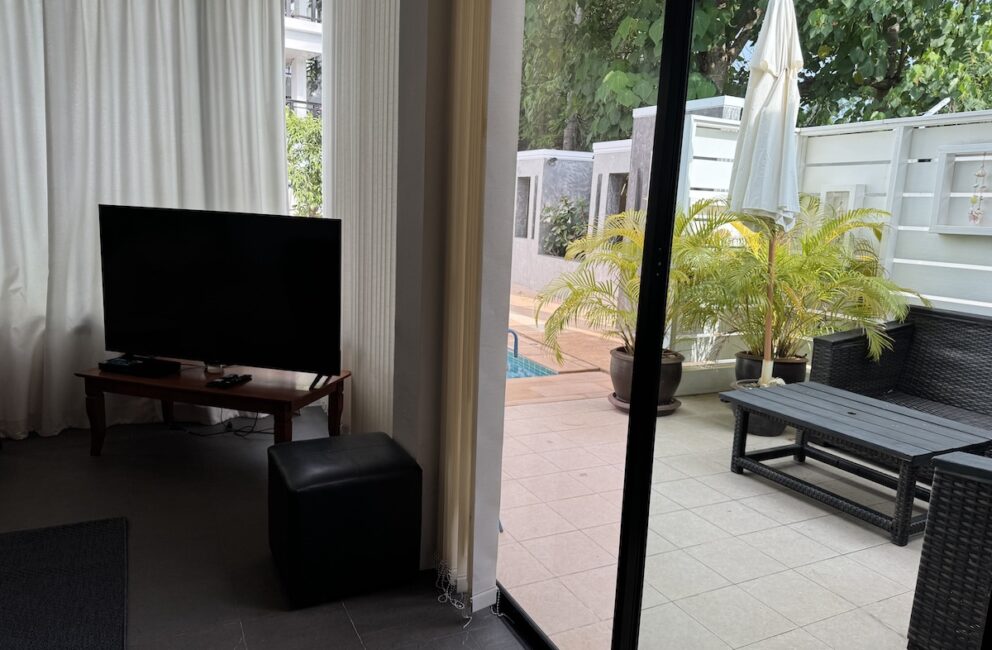Living room is adjacent to the kitchen with a chill area with Smart-Tv and AC. Bathroom with toilet, sink, hot water shower and access to the outdoor area with sofas and stairs directly into the 600 sq.m. pool. Bedroom 1 on the ground floor a double bed 150 cm wide, storage, working desk and AC.