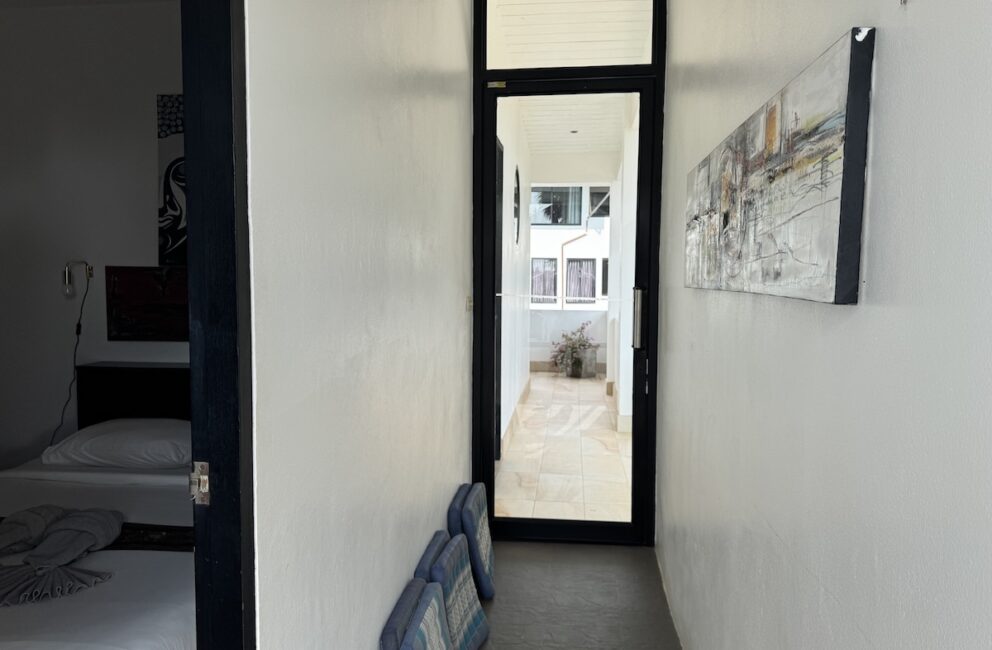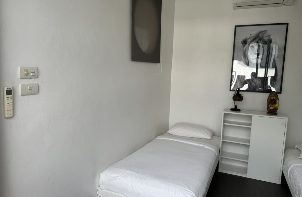 Upper floor has a balcony with view over the spacious pool. Second balcony or rather terrace, fits a dining table and some sun loungers. The hallway between the west and east side of the apartment you find the second bathroom with hot water shower, toilet and sink. Bedroom 2 contains a double bed 150 cm wide and AC. Bedroom 3 has a double bed, storage and AC.(pictures showing two single beds at the moment)