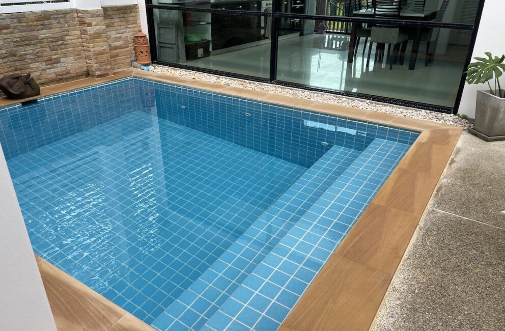 One story villa consisting of three buildings where the two bedroom buildings with their own bathrooms form a hallway to the courtyard where a 12 sq.m. pool is lit up in the evening. The inner courtyard connects to the third building with a living room and kitchen and associated sleeping alcove with bunk bed and a guest toilet.
