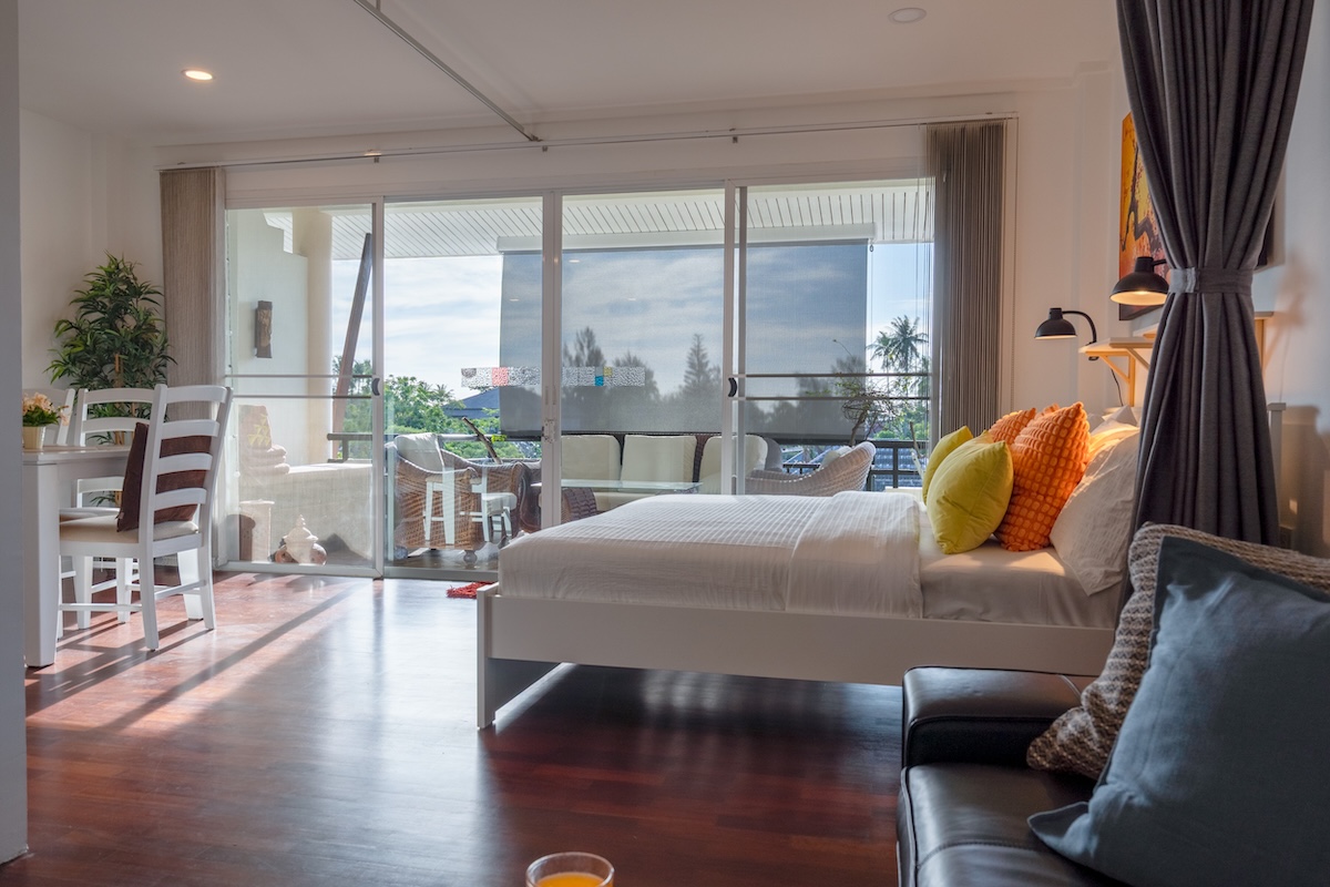 Open plan living room / bedroom with sofa area, Smart-Tv, wardrobes, Queen size bed behind a room divider, air conditioning and a balcony with a day bed and chill area for five persons with very towards the sunset.